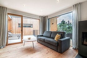 ...with balcony, separate living- and bedroom, wood flooring, 2 sofa beds, corner bench with table, designer drinking fountain made of natural stone with spring water, fridge, tea making facility, 2 TVs, WiFi, telephone, safe, bathroom with shower, WC, bidet, hair dryer, makeup mirror, wellness bag with bath towel and bathrobe.